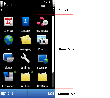 contains title pane , context pane , navi pane , signal pane , battery pane , universal indicator pane and clock pane sub-panes.
