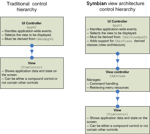 In a Symbian architecture, the view controller is derived from CAknView , which is derived directly from CBase and not from CCoeControl . This means the CAknView -derived views are not controls. CAknView -derived views need to contain CCoeControl -derived classes to provide visual representation on the display.