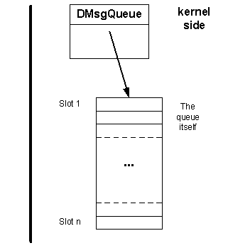A message queue is represented by a DMsgQueue kernel side object, to which the reader and the writer can open a handle, a RMsgQueue object. A message queue is a reference counted object, being derived from CObject , which means that it is not persistent; it is deleted when the last handle to it is closed. The queue itself is simply a block of memory divided into slots, managed by the DMsgQueue object.