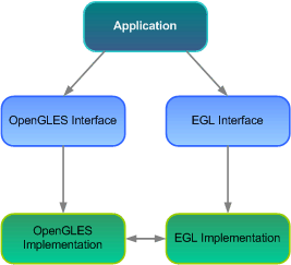 The following diagram shows the direct use of OpenGL ES by an application through the public OpenGL ES interface together with EGL. On the Symbian platform, both OpenGL ES and EGL have a component (shown in blue) that declares the interface, and both require an implementation that implements that interface (shown in green).