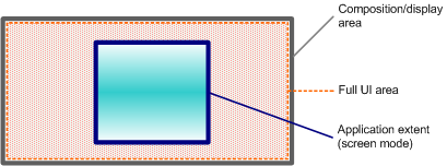 The following diagram illustrates how the full UI area is mapped to fill the display/composition area. The application's area (which corresponds to the screen mode) is referred to as the application extent in ScreenPlay.