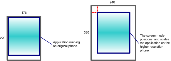 However, this approach did not work when phones with 320 x 240 pixel screens were introduced, because each axis required a different scaling factor. Symbian introduced the screen mode feature to handle this and similar use cases. Device creators define in the wsini.ini file a number of screen modes for each physical screen on the device. For each screen mode the device creator defines parameters to control the offset from the top left corner of the screen, the height and width in both pixels and twips, X and Y axis scaling factors and so on. The Window Server uses these to position and scale old applications so that they can run on new phones with higher resolutions, as shown in the following diagram (which is not drawn to scale). The screen mode is still used in the same way in the non-ScreenPlay variant .