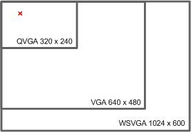 ScreenPlay handles application sizing and positioning in a fundamentally different way from the non-ScreenPlay variant. Using a fixed offset to position the application within the screen is inadequate when connecting to an external HDMI display, for example, when the resolution may not be known until runtime. For example, the offset designed for a QVGA display does not position the application correctly in a higher resolution display, as shown in the following diagram, where the red cross indicates the offset for a QVGA display.