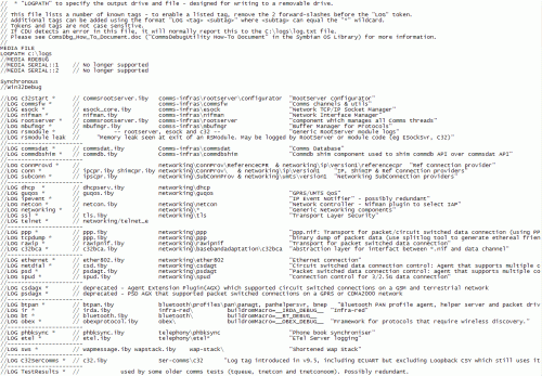 Comms Debug Utility (CDU) - This logging mechanism is currently used for the majority of Comms logging. It is the successor to Flogger and adds a two-phase logging system to give flexibility in debugging problems which are difficult to reproduce in debug binary files. It unifies Comms logging into one text file and allows the output to be redirected to RDebug for easier on-target debugging, or on emulator to the fast Windows Debug port. For more information see Post-processing CDU log files , Default CDU and Interpreting the log files .