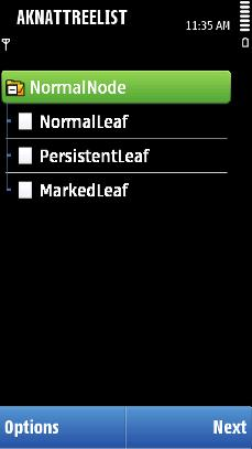 Unlike the other Symbian list types, the hierarchical list component is not structured on the A D column structure. Visually, the hierarchical levels are connected with vertical lines (see the figure below), and the folders in each hierarchy level are shown before files on that same level. Scroll bars function as usual (vertical bar is always present, horizontal bar is available when necessary), and the list does not loop by default, although it is possible to enable looping. Marquee scrolling is supported, but if not used, the names of folders and files are truncated where necessary. The height and the vertical distribution of the folder/file texts on the list is the same as in normal lists. Hierarchical lists can be used both in the main pane and as pop-ups.