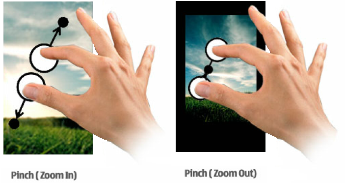 Moving the touch points (directly) closer to each other is recognized as pinch in. Application can use it, for example, for zooming out a picture. The behavior should be in relation to the speed and size of the stroke. |