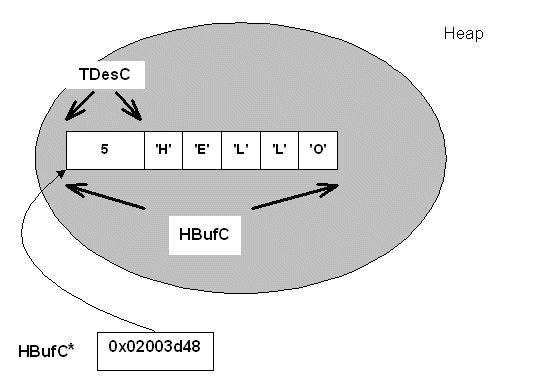 The base class, TDesC , contains a data member which holds the length of the data. The following drawing shows the layout of a HBufC object initialised with the string of five characters representing the English word "Hello". The descriptor object is allocated on the heap.