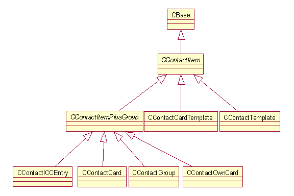 Each Contact Item contains a number of fields ( CContactItemFieldSet ). Each field ( CContactItemField ) in CContactItemFieldSet has a content type, ( CContentType ), and a storage type, ( TStorageType ) and the field data ( CContactTextField , CContactStoreField , CContactAgentField or CContactDateField ).