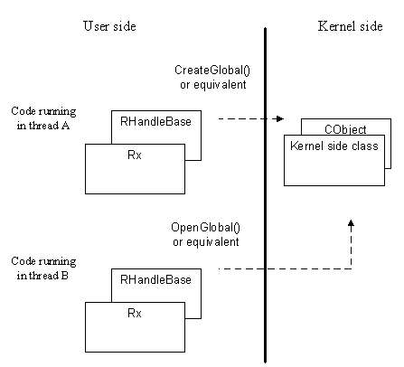 For a global handle. the corresponding Kernel object is assigned a name. The name gives that Kernel object an identity and is the key property which allows other threads to open a handle onto that same object. It is usual to use a TFindHandleBase derived class to locate a global Kernel object. The following diagram shows the general idea.