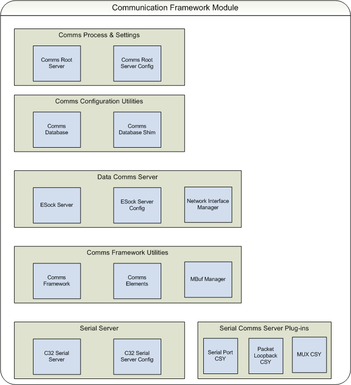 This collection contains the Comms framework, Comms Elements and MBuf Manager. For more information, see Communications Framework Utilities .