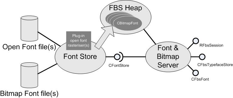 Fonts are stored on Symbian phones as files. The Font Store maintains a list of font files along with specifications for each font that the file contains. When an application requests a font the Font Store searches its list for the best match. If the font is a bitmap font the Font Store loads it into the Font and Bitmap Server's shared heap (unless the font is in eXecute In Place (XIP) ROM, in which case it is accessed directly from ROM). If the font is an open font the Font Store uses the associated open font rasterizer to rasterize glyphs into the heap as they are required. Font rasterizers are ECOM plugins.