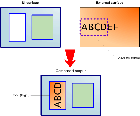 Video sometimes needs to appear cropped, so that a sub-area of the video is displayed instead of the full image. The crop viewport is specified in surface co-ordinates. The cropped viewport fills the output extent (or the window when the extent is not specified). The content appears scaled if the size of the viewport does not match the size of the extent (or the window).