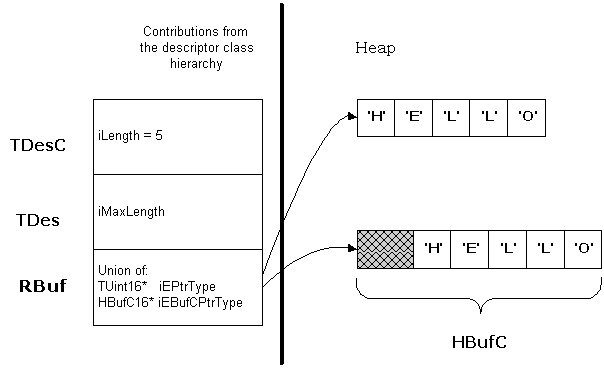 The following drawing shows how an RBuf type is constructed. It is derived from TDes and TDesC ; the member data of these base classes hold the length and maximum length for the descriptor data. RBuf itself only contains a single pointer. The pointer is interpreted in one of two ways, depending on how its buffer has been set up: