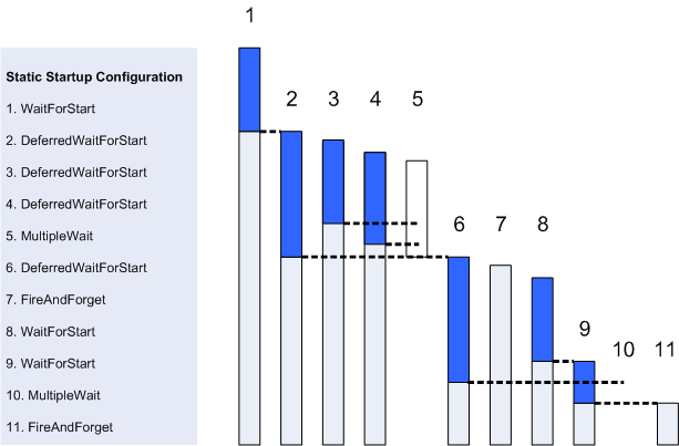 In the diagram above each vertical bar represents a process or application started during the startup procedure. The list on the left shows the SSC command for each process. An application may ‘rendezvous’ with the starter when its initialisation (shown in dark blue) is complete and it is ready to be used by dependent applications. A rendezvous is simply a signal from the appliation to the starter that it has reached a designated point.