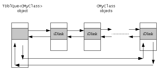 The TDblQue class takes a class template parameter which defines the type of object which is to form an element of the list. In this example, objects of type CMyClass form the elements of the list.
