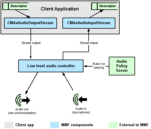 The functionality provided by Audio Output Streaming is contained within the CMdaAudioOutputStream class.