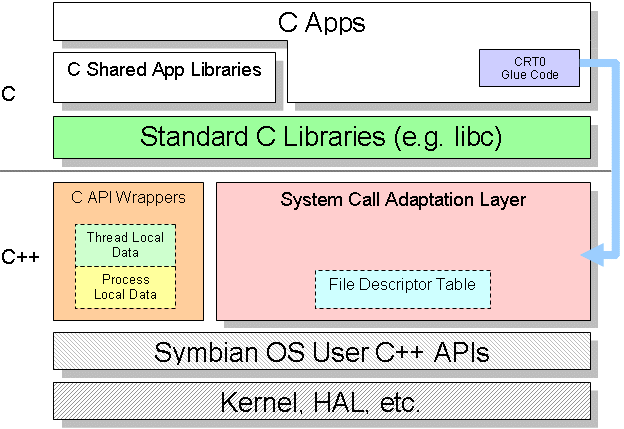 Traditionally, in Unix-like systems, system calls are implemented in the kernel, separate from the C libraries. On the Symbian platform, the 'System Call Adaptation Layer' runs in the context of the user side but is considered 'kernel-like' code. APIs that belong to this layer are tagged as @internalComponent and may only be extended by Symbian.