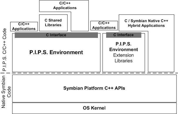 This diagram shows how P.I.P.S. fits in with the Symbian platform, and also how C/C++ applications, additional C shared libraries and hybrid applications developed by third party Symbian developers using P.I.P.S. fit in.