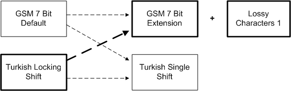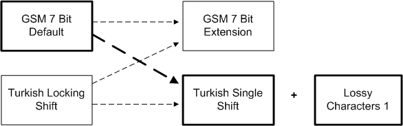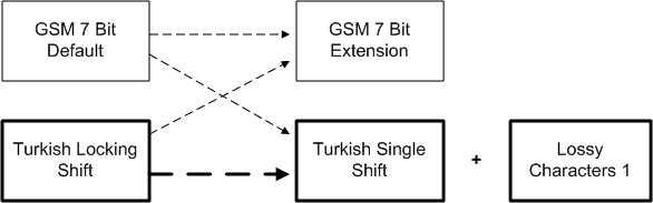 Turkish Locking Single Converter. The highlighted boxes in Figure 3 show that it supports the Turkish locking shift alphabet, Turkish single shift alphabet and the set of lossy conversions supported by the standard converter. This converter is identified by the KCharacterSetIdentifierTurkishLockingAndSingleSms7Bit UID, which is defined in the charconv.h header file.