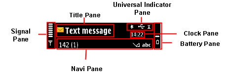 The Status pane displays status information of the current application and state, as well as general information about the device status, such as signal strength and battery charge. The Status pane may also be totally left out in certain applications or situations.