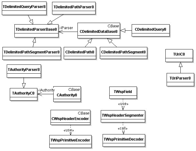 URI classes namely, CUri8 , TUriC8 and TUriParser8 provide functionalities for parsing generic and SIP URIs. CUri8 class provides a reference to a TUriC8 object so that the non-modifying functionality can be used. TUriC8 is used to obtain information about an URI.