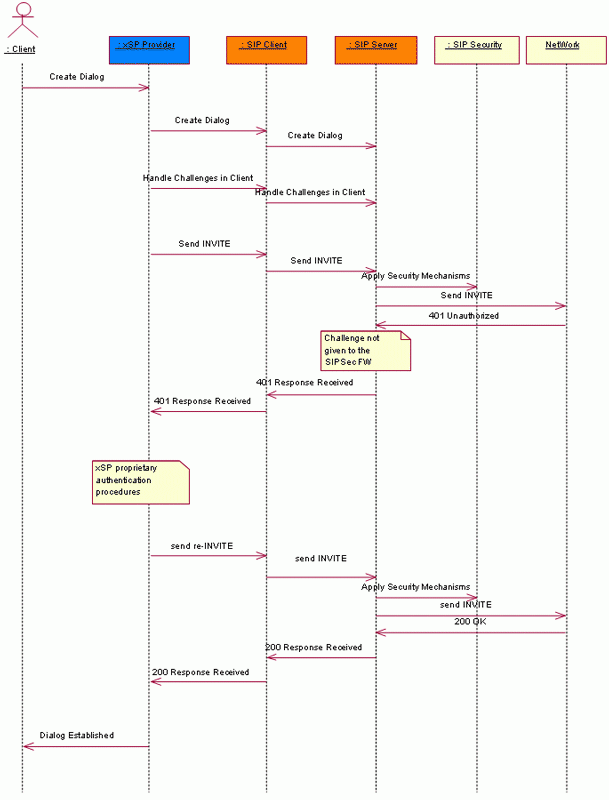 In the following illustration the client handles authentication challenges related to the session initiation. All the authentication errors are then forwarded to the xSP provider. When an error is reported to the provider, it runs a proprietary authentication procedure and tries to reinitiate the session.