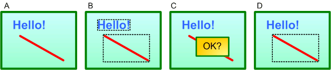 This has the advantage that the Window Server knows that the area of the window that has the "Hello!" text is not affected by the drawing of the red line. There are also advantages when some or all of the window needs to be repainted. For example, suppose another window (such as an OK dialog box) appears above the window (as shown in C). When the dialog box is closed, the Window Server repaints the screen behind the dialog box. Because in this example the OK dialog box was entirely within the red line's bounding rectangle, the Window Server simply replays that rectangle's drawing operations (D). This is more efficient than repainting the whole window.