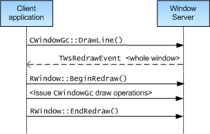 However, in earlier versions of Symbian you could, for example, draw the red line without bracketing it within BeginRedraw() and EndRedraw() calls. This is called non-redraw drawing . In ScreenPlay, each non-redraw drawing operation triggers the Window Server to invalidate the entire window. This means that the client application must then perform a full window redraw, as shown in the next diagram.