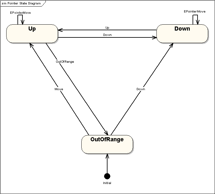 The driver sends a number of types of event to move the pointer between these states. For example, EButton1Up is an Up event that changes the pointer from the Down to the Up state. EButton1Down is a Down event. EButton1Down changes the pointer from the Up to the Down state, and from OutOfRange to the Down state.