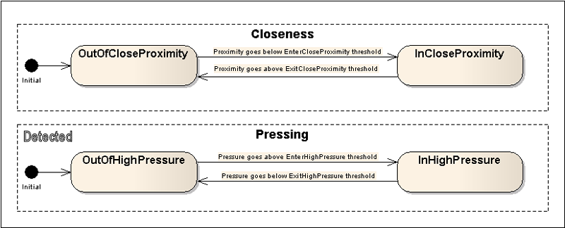 The following diagram shows the extension of the Up and Down states with additional substates. Up is extended with substates describing the closeness of the pointer to the screen. Down is extended with substates describing pressing .