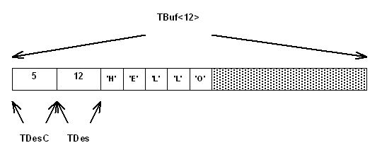 The base class TDesC , contains a data member that holds the length of the data. The base class TDes , contains a data member that holds the maximum length of the data. The following drawing shows the layout of a TBuf<12> object initialised with the string of five characters representing the English word "Hello".