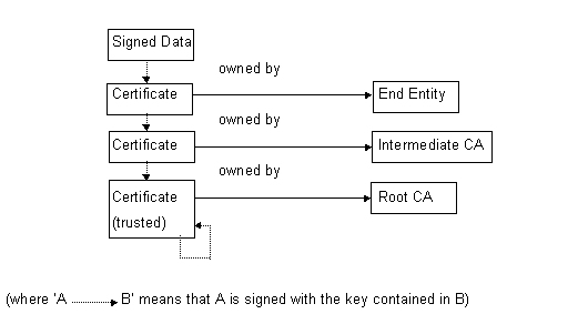 Certificate validation is a recursive process. It begins with the need to verify the signature on some data presented by an End Entity (EE). This involves checking that the key pair is actually owned by that EE. To do this the public signing key of that EE is acquired by getting its certificate. That certificate would have been signed by the EE's certification authority (CA), so the signature on the certificate can be verified by getting the CA's public signing key. In turn the CA's certificate might require verifying in which case the process is repeated until the process bottoms out when an entity which is already trusted is reached; that entity is usually self signed. This process is illustrated in the figure below: