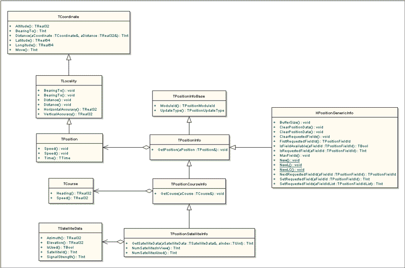 The Location Acquisition API defines a set of position data classes. Some of these classes store the co-ordinates of a location fix and others store information about course and positioning satellites. The API also defines position info classes that wrap the position data classes. These classes are used to pass data across the Location Acquisition API. Figure 1 illustrates the position data and position info classes with some of the most important methods.