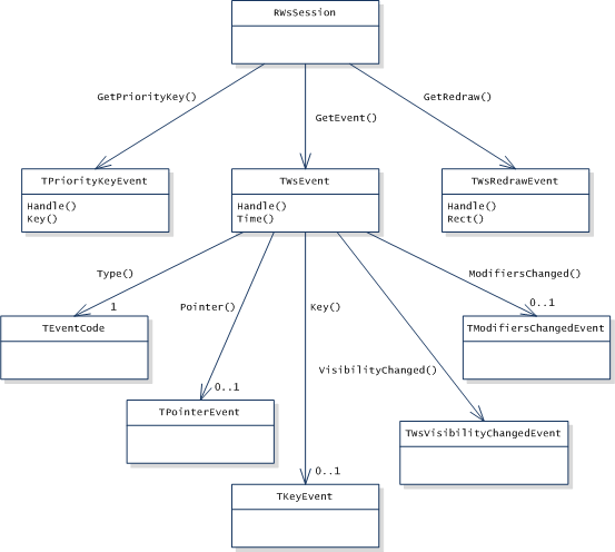 The Window Server maintains a server-side buffer of all events queued to an application—each application has its own queue within the buffer (this is only for general events—redraw and priority key events are handled by a different mechanism). Each application must handle events appropriately. The RWsSession::GetEvent() function (or RWsSession::GetRedraw() or RWsSession::GetPriorityKey() ) must be called as the first stage of handling a completed request, and the event must then be analyzed and handled.