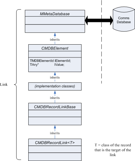 A link is represented by the templated class CMDBRecordLink<T> . The template parameter defines the type of record to which the link refers.