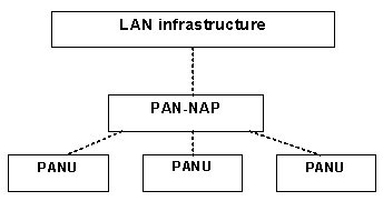 The following image shows a Bluetooth-enabled laptop accessing the Internet through a mobile handset that is acting as a PAN-NAP device. The Bluetooth handset may provide the uplink via GPRS, WIFI, dial-up, or in some other way.
