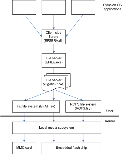 The Symbian platform File Server has multiple threads. There is a thread for each drive in use and a main thread that receives the requests from clients and sends them to the drive threads. Synchronous drives, however, do not have their own drive thread; requests for these are processed by the main thread. There is also a separate thread for processing session disconnect requests.