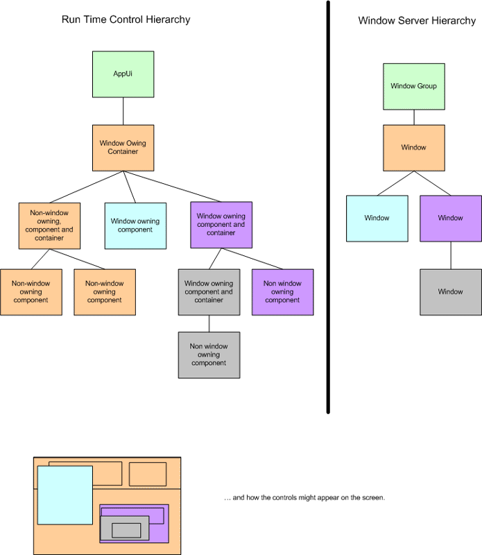 At run-time all controls in an application are related to each other in a tree hierarchy. The top-level window-owning controls are owned by the AppUi. This is similar to the hierarchy of windows that exists in the Window Server which has a group window for each application at the root. It is important to understand the relationships between window-owning and non-window owning controls. The diagram below attempts to illustrate these.
