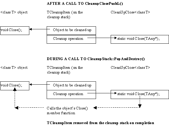 The way in which these work is best illustrated graphically by taking CleanupClosePushL() as an example. See the diagram below.