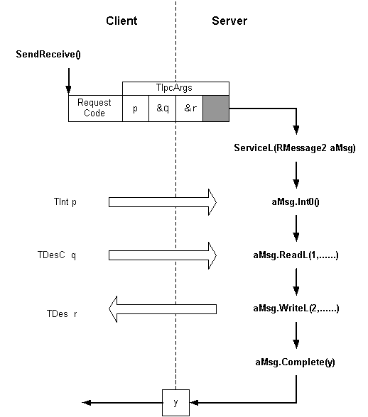 The client-server message protocol supports the passing of a 32-bit request code and four 32-bit parameters from client to server and returning a 32-bit result from the server to the client. The parameters may be interpreted as plain integers or pointers; pointer types may be untyped ( TAny* ) or descriptor types ( TDesC8* and TDesC16* ) that the server can use to access the client’s address space. The request code, parameters, and the parameter types are packaged into a TIpcArgs object. The parameter types are stored in the kernel side message object so that the kernel can check that subsequent operations requested by the server using the message are: