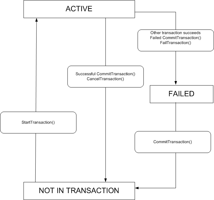 On success the session returns to Not in transaction. On failure it enters the Failed state. When a transaction fails, the operations already performed are discarded and no subsequent operations can reverse the failure.