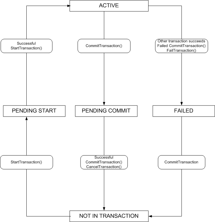 Synchronous transactions have the disadvantage that a busy server may block the client thread before any action takes place. To avoid this problem you can use the slightly more complicated asynchronous transactions. An asynchronous transaction has the same structure as a synchronous one except that there are two new states Pending Start and Pending Commit where a transaction waits until the server is ready to communicate with it. The transition from Not in transaction to Active now proceeds like this.
