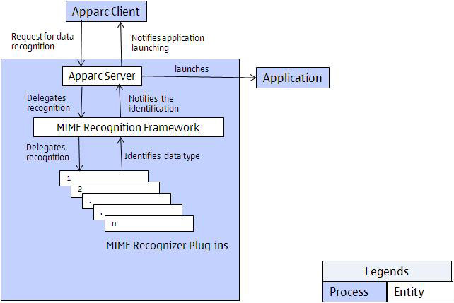 The MIME recognition framework implements data type recognition using MIME (data) recognizers. The MIME recognizers are ECOM plug-ins. A MIME recognizer reads a small piece of the data. A data type can be recognized by more than one MIME recognizer. The framework uses the concepts of priority and confidence level to determine the data type.