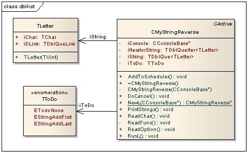 The example creates a doubly linked list of objects of the TLetter class. This list represents a character string. An object of class CMyStringReverse owns this string. The user can edit this string using the functions defined in the CMyStringReverse class. The following edit operations are possible: