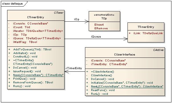 The example creates an object of the CTimerEntry class. This is a CTimer derived class. An object of this class generates timer events by using the CTimer::After() function. The data member of this class, iQueue is a delta list. The offset value of each node in this list is the tick count after each timer event. The CTimerEntry::Arbitrator() function decides the action to be performed for each event generated by the timer. It either adds tick counts to the list or removes elements from the list based on the state of the queue.