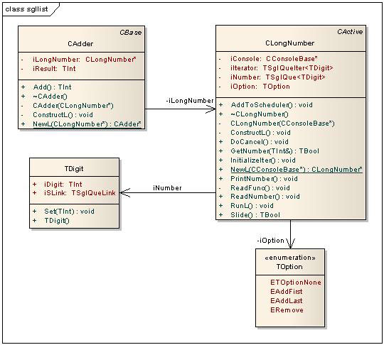 The example creates a singly linked list of objects of the TDigit class. This list represents a long number. An object of class CLongNumber owns the list. The user can edit this list using the functions defined in the CLongNumber class. The following edit operations are possible:
