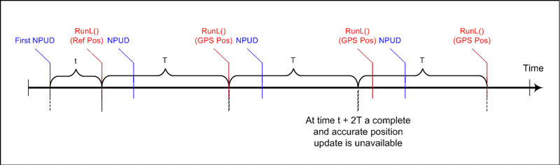 The next position update is expected at time t + 2T, but in the case shown in figure 2 this is not possible (the mobile device may have moved into an area where the GPS signal is weak). In general if it is not possible to obtain an accurate GPS fix by time t + nT, but the fix is obtained a short time later, the next position update is delivered as soon as possible after time t + nT (after t + 2T in figure 2).